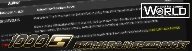 Зайдите на http://world.needforspeed.com/ в любое время в апреле и введите этот код: EGBZ-LUPC-6GXJ-BKWS, чтобы получить подарок.