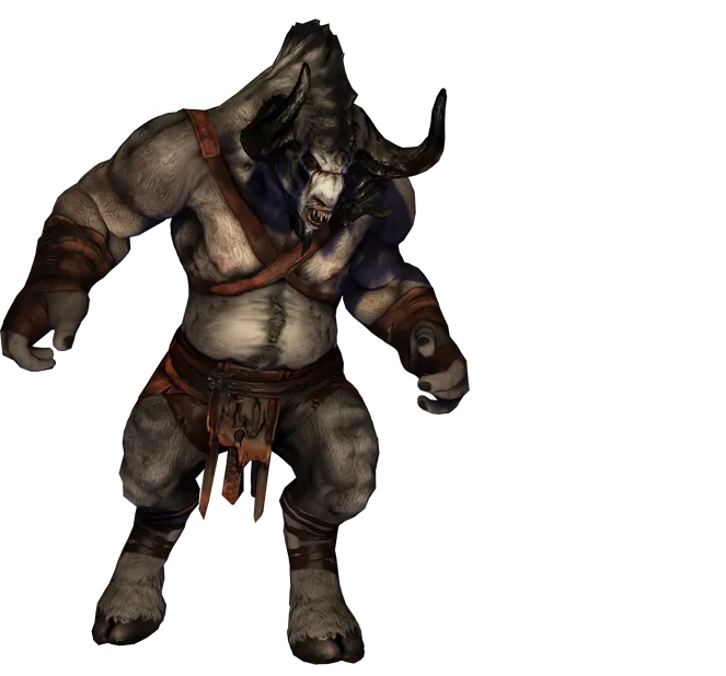 Огромная раса быкоподобных существ. Минотавры сильны и беспощадны. Кроме того они полностью независимы, без связей или отношений с любым другим цивилизованным народом. Они никогда не торгуются с другими, если им что-то нужно - они получат это. Они слишком горды и никому не поклоняются. Последней расой, оскорбившей их, были эльфы... и минотавры уничтожили их за это.