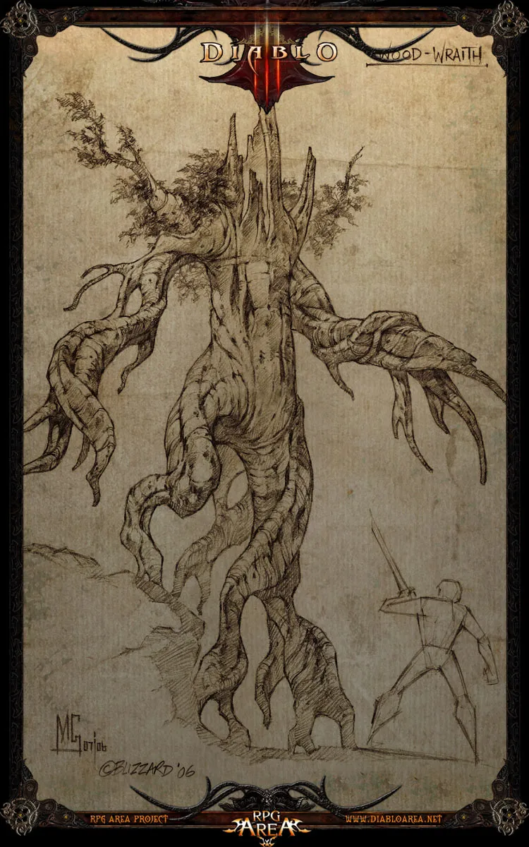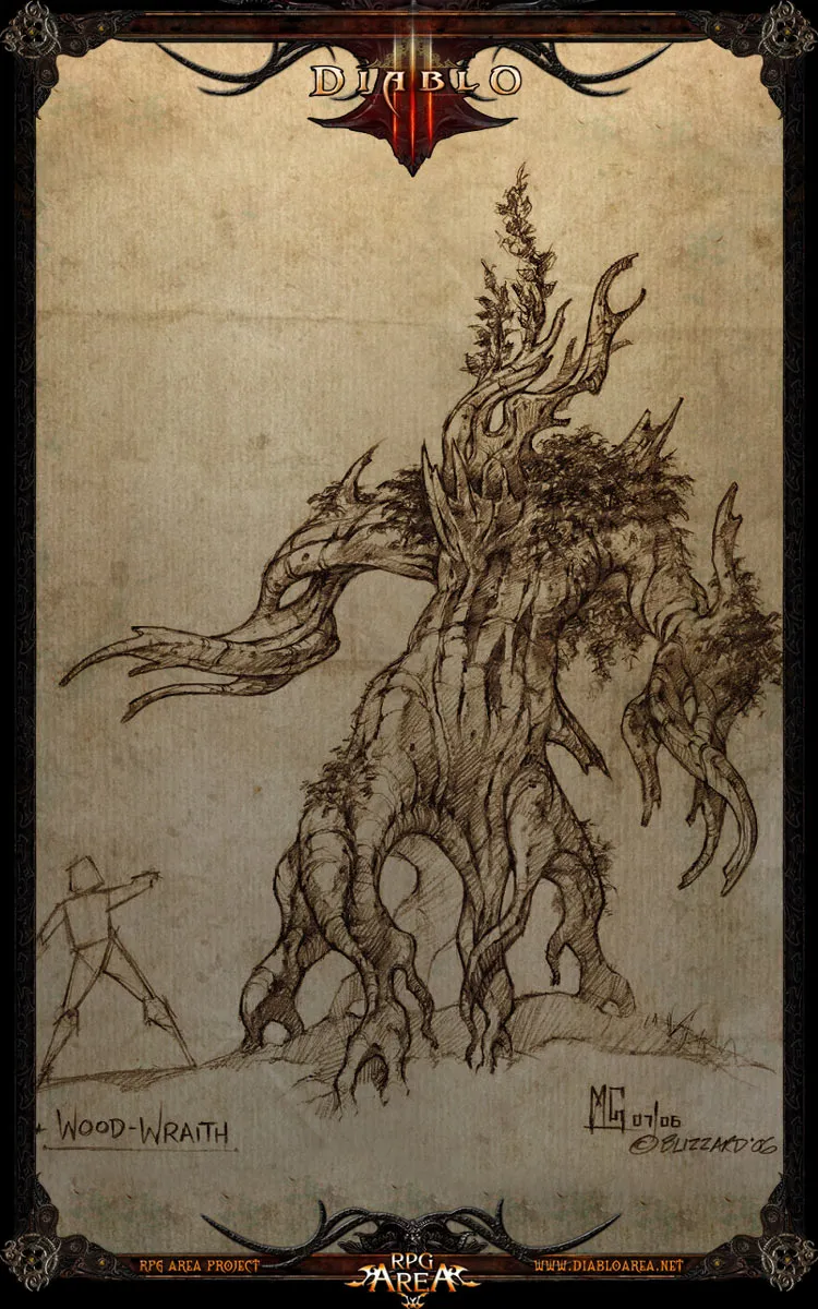 По словам мастера ДеСото, Гниющий лес оправдывает свое название тем фактом, что все в нем кипит и бурлит от зла: известны случаи, когда сама земля разверзалась и пожирала людей. Когда я стал расспрашивать его непосредственно о корявых ходоках, ДеСото начал пространно разглагольствовать об их истинной природе. Он утверждал, что ходоки – злобные мистические создания из другого мира, которые могут поддерживать свое существование в нашем мире, только поглощая жизненную энергию людей или животных. Эти мерзкие создания приняли облик деревьев, чтобы заманить добычу как можно ближе к себе и поглотить ее целиком, увеличивая тем самым свои запасы темной силы. Эти зверские создания передвигаются тяжелой поступью, а некоторые распространяют вокруг себя заразный смрад, отравляющий их жертв. Мастер ДеСото уверен, что причинами появления ходоков и Гниющего леса являются грязные деяния некромантов, которых он считает ответственными за зло, обрушившееся на наш мир. Он также подробно описал мне свою теорию о том, что «случай с Диабло», как он его назвал, был тоже частью темных ритуалов.
