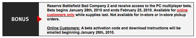 Сделайте предварительный заказ Battlefield Bad Company 2 и получите доступ к бета-версии мультиплеера игры для PC. Бета-тест начнётся 28 января 2010 года и закончится 25 февраля 2010 года. Доступно только для клиентов заказавших цифровую версию Battlefield Bad Company 2 и оплативших заказ.