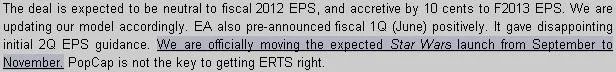 Финансовые отчеты крупного журнала Barron's "предполагают", что месяцем выпуска долгожданной ММОРПГ станет Ноябрь 2011 года. Основанием для подобного прогноза стала покупка Electronic Arts известной PopCap Games (кто кого купил, думаю, понятно), которые являются лидерами в разработке казуальных игр (покупка обошлась электроникам в 750 миллионов долларов с потенциальным подъемом). К тому же, журнал получил информацию о негативных прогнозах по показателю прибыли акцию (EPS) во 2-м финансовом квартале (он заканчивается в сентябре 2011 года).