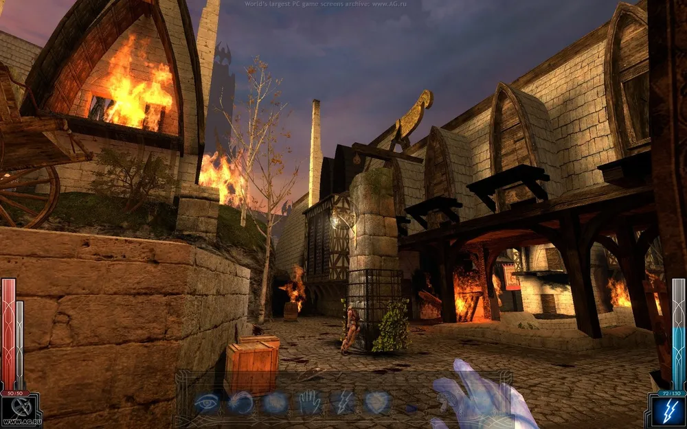 Почти восемь лет назад Arkane создали одну из первых action/RPG Arx Fatalis. Трудно поверить, что в те годы могла появиться игра с физическим движком, который позволял двигать и швырять объекты - а ведь это лишь малая часть возможностей Arx Fatalis. Игрок мог без каких-либо меню, даже не забирая в рюкзак, смешать воду и муку, получив тесто. Затем положить тесто рядом с огнем и испечь хлеб, которым восстанавливал здоровье. Огонь разжигался магией: зажав кнопку, игрок чертил на экране курсором магические руны, и все близлежащие деревянные объекты загорались.