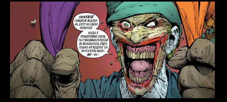 В буквальном смысле гниющий Джокер, который больше напоминает главного злодея из мясного хоррора, решает помочь Бэтмену избавиться от его слабости, а по мнению Джокера главная слабость Бэтмена – его семья,другие Готэмские герои. Тут Снайдер неплохо раскрывает Уэйна, чрез его взаимоотношения со своими помощниками во всей этой ситуации, плюс огоньку подливает и интрига, что Джокер может знать их настоящие личности. Джокер – личность театральная, финал истории — это готическая постановка, декорациями которой служит лечебница Аркхем, все создано для Бэтмена, Смерть семьи событие метафорическое, все будет, так как видит окончательно обезумевший Джокер, обезумевший настолько, что даже Харли Квин, вместо любви испытывает страх и омерзение.