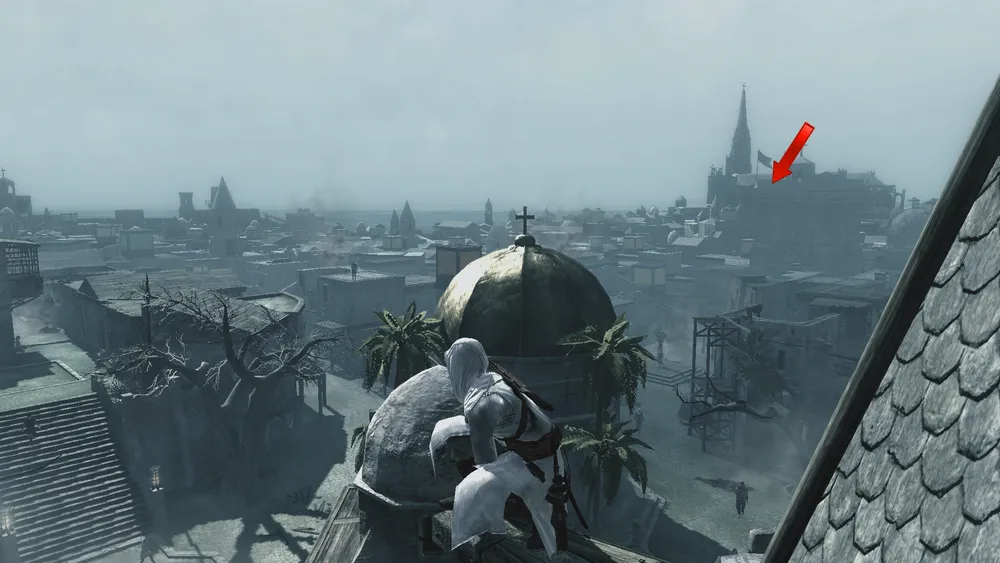 Поднимаемся на одну из точек обзора и осматриваем город. Мы видим другие точки обзора, а также точки интереса, но нам нужна крыша, на которой был бы изображен знак ассасинов (этому мы научились в Дамаске, где Бюро найти довольно просто). Ничего похожего поблизости нет. Ну что ж, давайте посетим другую точку обзора, расположенную неподалеку от первой.