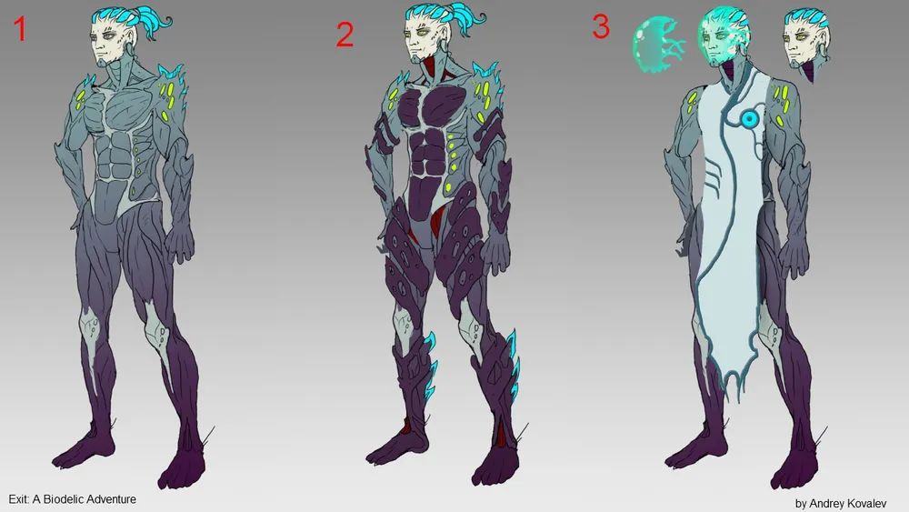Пару недель назад я рассказывал здесь про биопанковский квест, который разрабатываю. С тех пор получил много полезной и справедливой критики, в том числе про внешний вид главного героя. Критику стараюсь учитывать и сейчас занимаюсь поисками нового образа для персонажа. Какой из эскизов потенциально нового героя (автор - Андрей Ковалев) нравится вам больше всего, какие детали кажутся удачными или не очень?