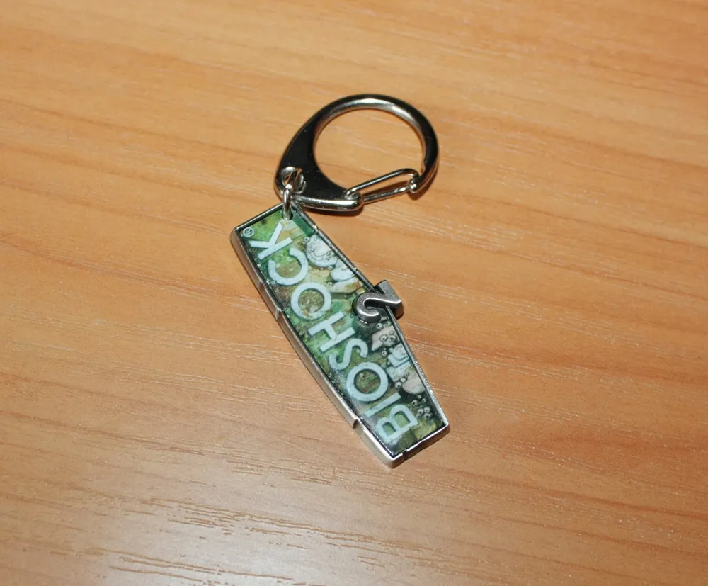 Стильная штука. По краям есть вмятины и неровности, но поцарапаться или зацепиться за них не получится, потому что это не дефект, а стилизация. Но ключи носить на нем я не рискну – внутренняя часть брелка представляет собой картинку, залитую пластиком, и от постоянного ношения он вполне может отодраться или поцарапаться, особенно учитывая, что у брелка Дальнобойщиков 3 отвалилось уже два колеса из четырех, пока я его ношу. Проблема тут не в брелке, а во мне, потому не волнуйтесь, с качеством у BioShock 2 все в порядке – качество подтверждено кучей копирайтов, которые выгравированы сзади: