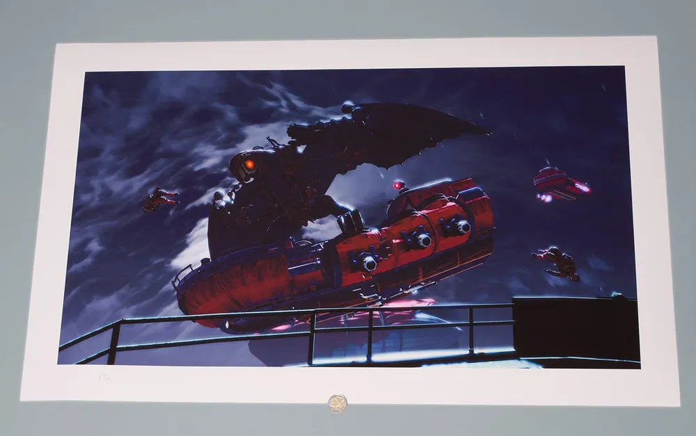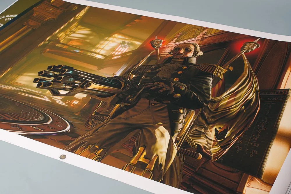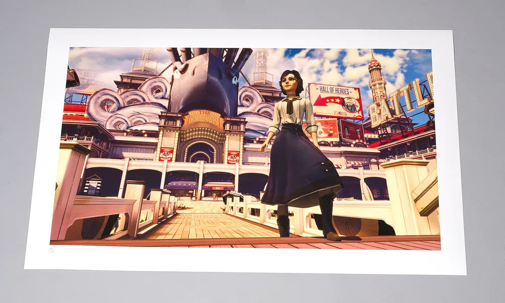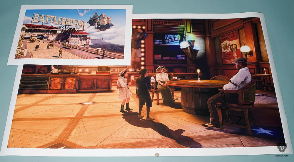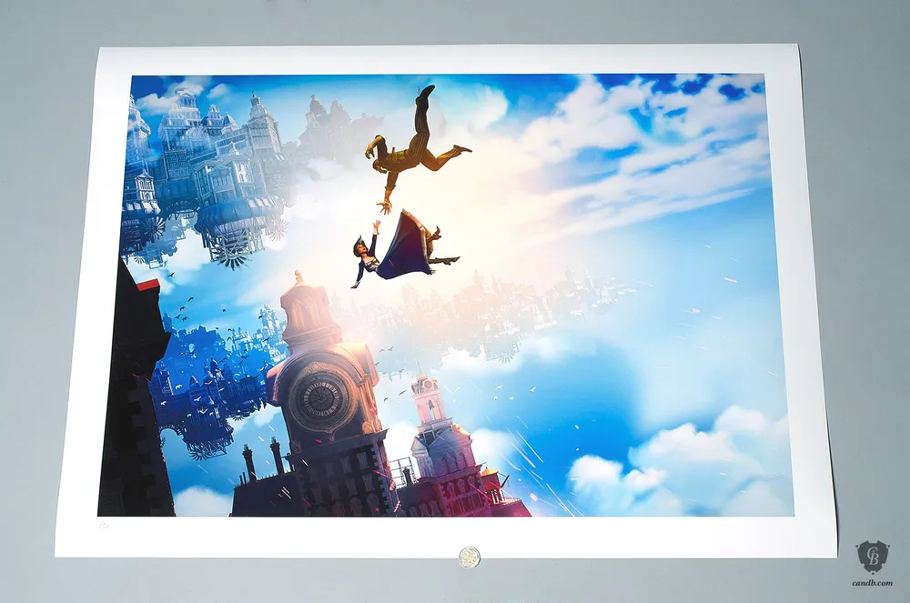 Компания Cook & Becker, занимающаяся продажей предметов искусства, в сотрудничестве с Irrational Games (еще месяц назад, 25 апреля 2013, так что это не новость, а старость) объявили о выходе литографий по мотивам игры Bioshock Infinite. Каждая литография вручную пронумерована и подписана Кеном Левиным (Ken Levin). К каждой литографии прилагается сертификат подлинности, все они являются сертифицированными жикле музейного качества (жиклe - эксклюзивные цифровые художественные репродукции шедевров живописи на холсте, по качеству исполнения и цветопередачи не уступающие оригиналу).