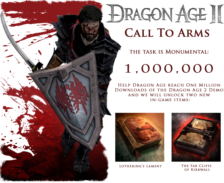 Разработчики грозятся, что если демо будет скачана 1 000 000 (миллион) раз в сумме на всех платформах до 1 марта, все игроки в DA2 получат доступ к двум бонусным предметам.