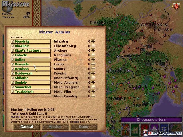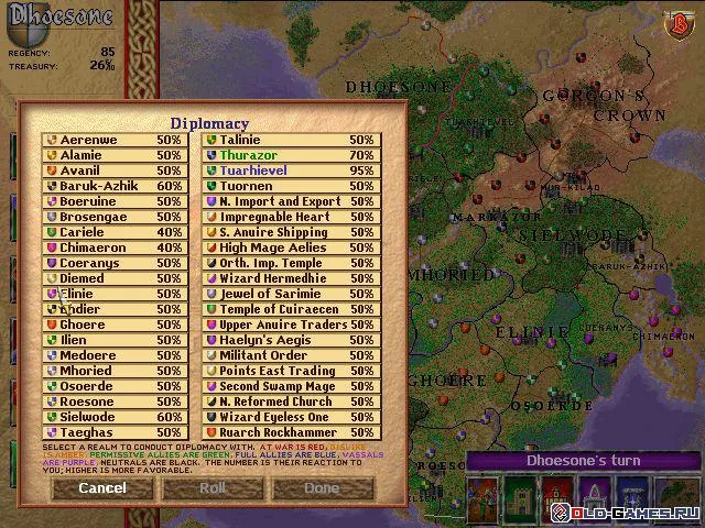 Игра начинается с того, что перед вами появляется карта Ануира, на которой требуется выбрать себе страну, сюзереном которой вы и станете. Не все государства могут быть выбраны. Владения awnsheghlien, а также несколько наиболее сильных королевств нормальных регентов и монстров-гуманоидов недоступны – первые являются врагами, с ними даже нельзя вести дипломатию, за исключением Руобхе Убийцы Людей, но и это могут только регенты эльфийских государств, а вторые представляют больший интерес как союзники, чем как управляемая игроком страна. Пятнадцать человеческих, два эльфийских и одно гномье владение – вот и весь выбор. Все владения существенно различаются размерами, могуществом, цивилизацией и другими особенностями, причём самое большое владение – далеко не всегда самое сильное. Выбирая государства, вы вызываете их описания в левой части экрана, вместе с двумя кандидатами на пост регента. Одного вы можете сделать олицетворением вашей собственной персоны, другой станет первым лейтенантом. Все кандидаты – это персонажи со своими именем, историей, снаряжением и характеристиками типа силы, интеллекта, мировоззрения и так далее, знакомыми каждому любителю D&D. От выбора регента зависит очень многое, а что именно – опишу отдельно.