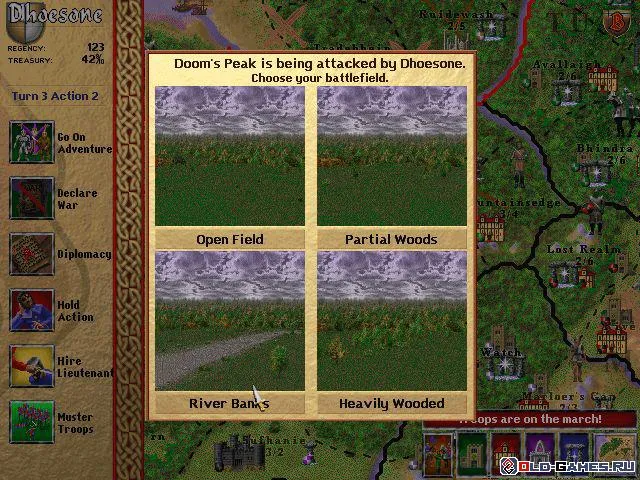 Первое, что нам предложат – выбор поля боя. Это право, впрочем, за обороняющимися, так что если напали мы сами – выбор за противником. Для разных видов рельефа есть разные разновидности полей, но смысл один – левое верхнее поле наиболее ровное и укатанное, просто для кавалерийского натиска, а правое нижнее – наиболее пересечённая местность, где сам Азрай ногу сломит, войска едва ползают, а огненные шары отскакивают от природных препятствий. Некоторые клетки поля и вообще непроходимы.