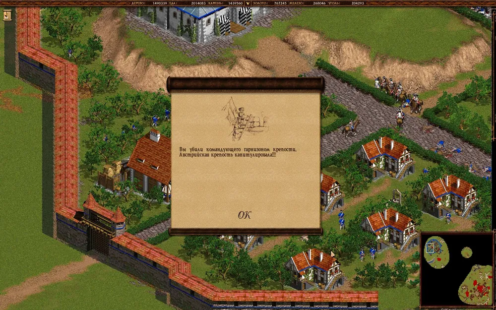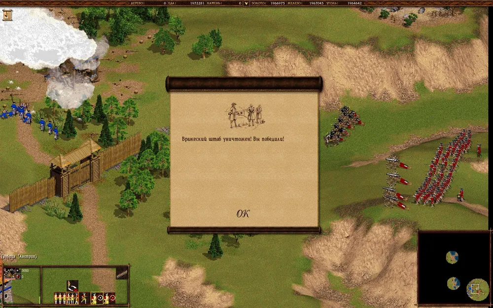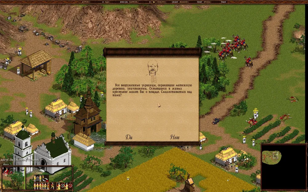 Остается лишь атаман. Стройте средний отряд драгун и отправляйте к врагу. Перешеек охраняют сердюки за частоколом, но с ними проблем не будет. Пробейте рукопашниками (например, сечевыми казаками) стену и отправьте ваш отряд по душу главаря мятежников. Нет человека — нет проблемы. Победа.