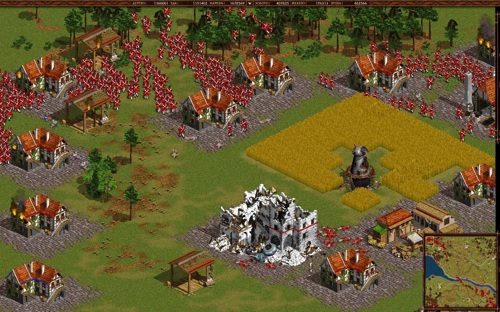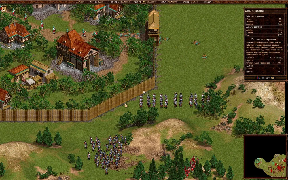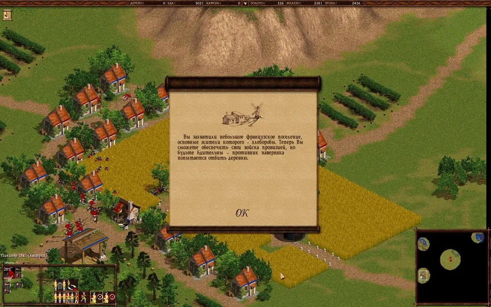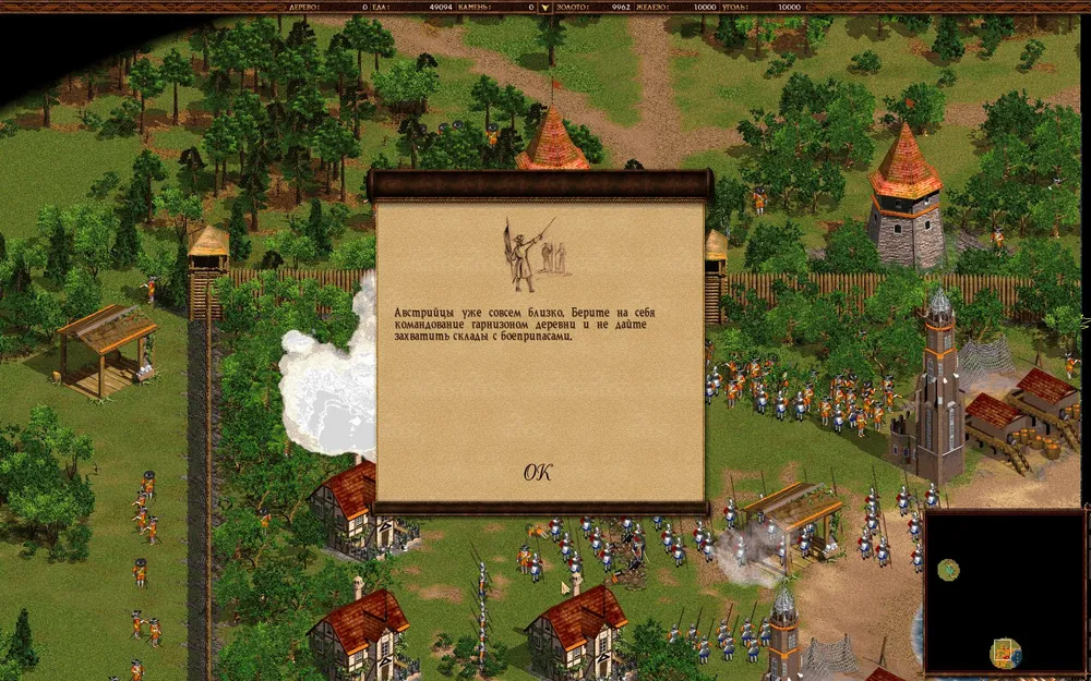 Клепайте пикинеров 18 века в промышленных масштабах и постарайтесь защитить золотую шахту. Село на юге тоже можно потерять, но потом отбейте его и начинайте отстраиваться.