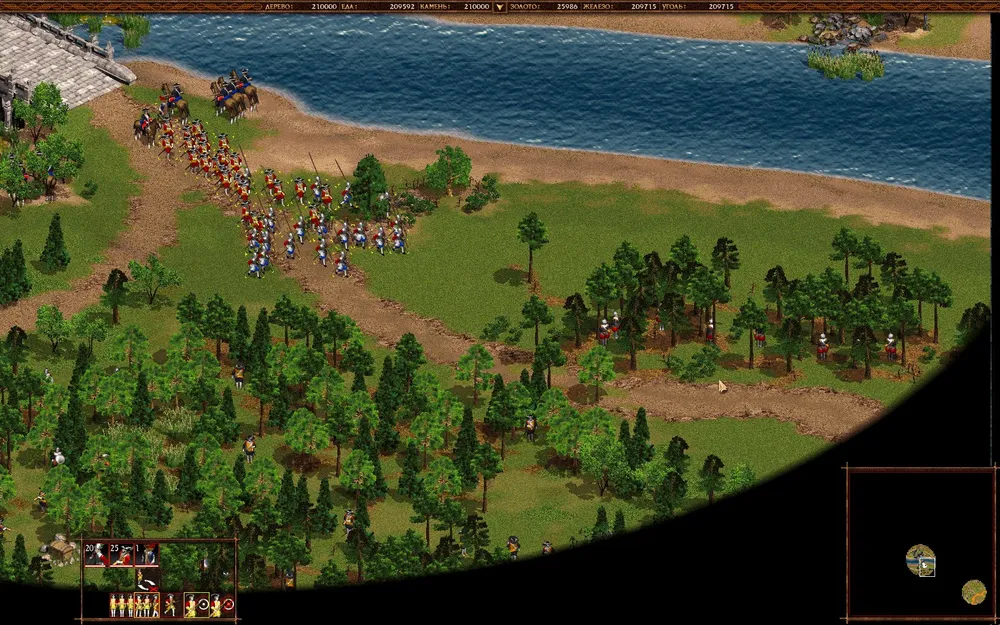 Итак, медленно продвигайтесь северным отрядом к мосту, уничтожайте пушками врагов на той стороне и аккуратно выдвигайтесь вперед (не растягивайтесь, а то рискуете потерять войска в боях с вражеской конницей).