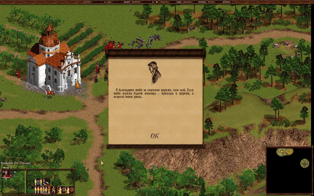 Еще восточнее вам предстоит защитить церковь от сожжения. В случае успеха, ваши войска будет лечить священник (правда, для этого придется к нему наведываться).