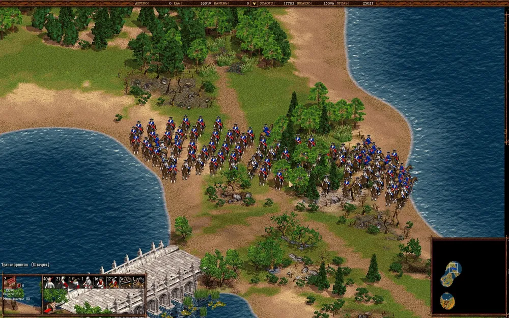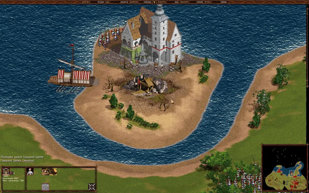 Захватываем начальными войсками поселение и начинаем разиваться. Вся нижняя часть карты — наш берег. По нему разбросано немалое количество месторождений, которые только и ждут, чтобы на них построили шахту. Копим ресурсы, строим порты и шебеки.