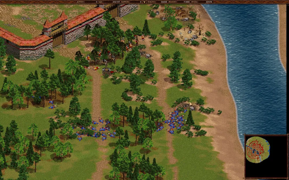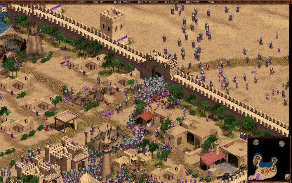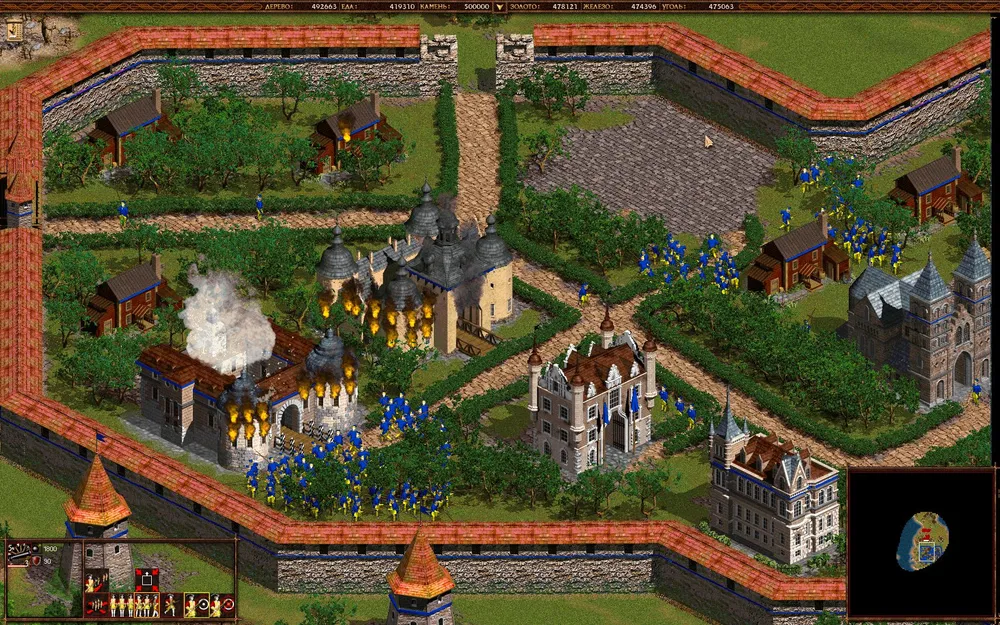 Отстраивайтесь, захватывайте шахты и набирайте орду гренадеров-наемников и прокачанных пикинеров. Штурмуйте поселение врага (в принципе, можно постепенно продвигаться с запада, но вряд ли быстрее выйдет), уничтожайте в первую очередь башни. Казармы и конюшни врага уничтожать долго, можете не заморачиваться.