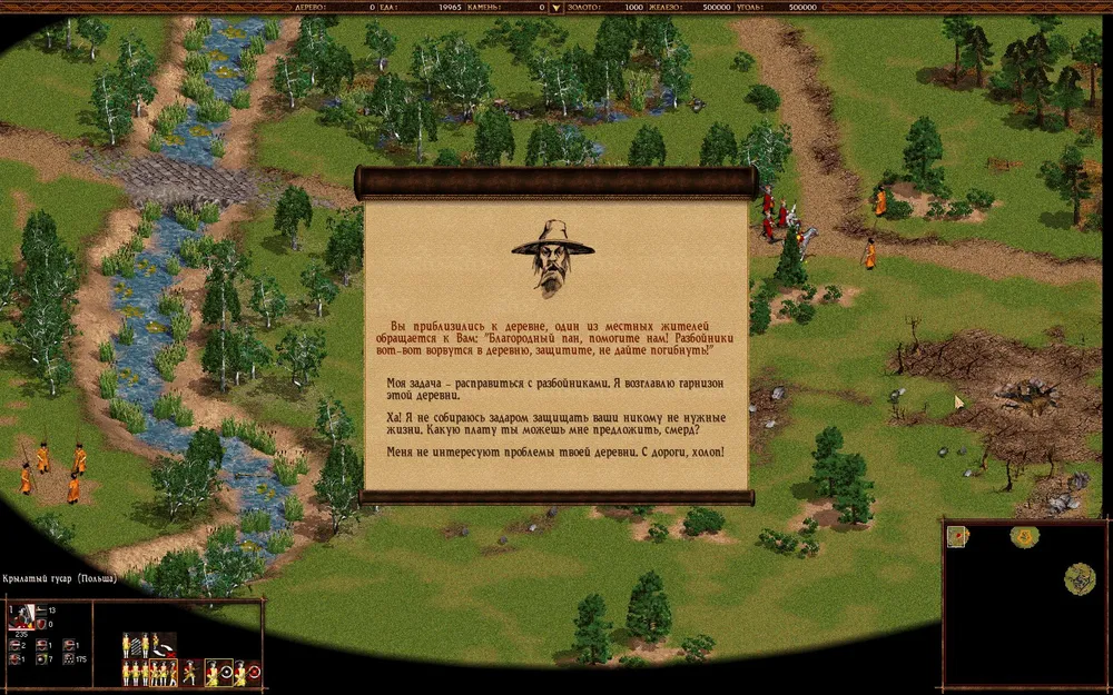 У нас под началом один Рейтар — это вы, так что этого бойца терять нельзя. Наша задача — спасти крестьян, пока их не увели в рабство. Идем к деревне на западе, попутно собирая отряд. Юго-западнее деревни будет разбойничий лагерь, его тоже уничтожьте. Затем продвигайтесь по дороге на северо-восток. Многоствольное оружие, в принципе, вам не нужно, но можете взять, денег достаточно. В очередном населенном пункте обзаведитесь пушками и продвигайтесь на запад, к цели. По пути вы натолкнетесь на заставу, вам предложат заплатить за проход. Лучше заплатить, не потеряете войска.