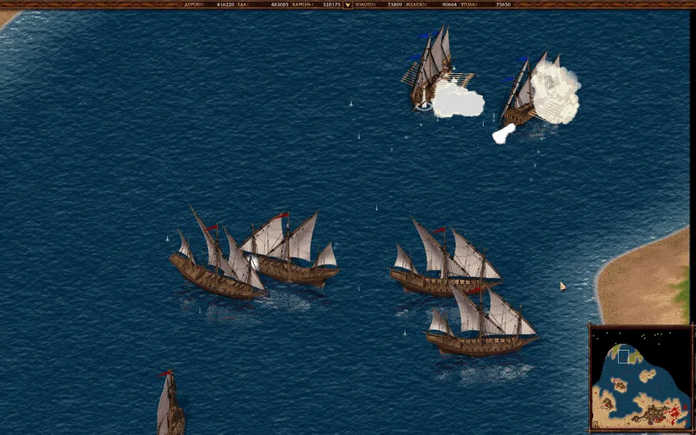 Захватив алжирскую золотую шахту, принимаемся за испанцев. Строим дюжину шебек, проводим усовершенствования пушек и, проплыв по центру, уничтожаем порты и встреченные корабли (пушки можно даже не трогать). Оставляем шебеки в центре для отражения карательного флота. Уничтожаем корабли и празднуем победу.