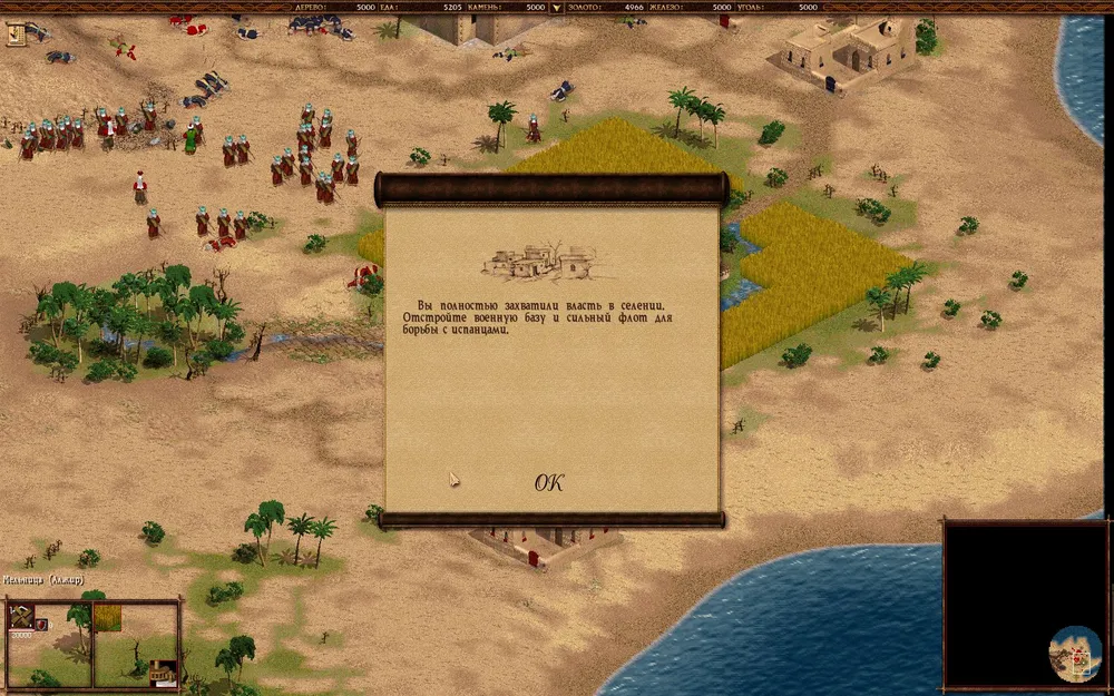 Также с самого начала миссии нам предложат торговать с Алжиром, так что, очистив дорогу до него от кочевников, сможете отправлять туда караваны с деревом, получая золото. Только вот получится сделать так один или два раза, потом он решит, что нас проще захватить. Где-то в это же время не пропустить пару испанских кораблей, которые попытаются уничтожить ваш порт (неплохо заранее сделать улучшение на защиту зданий, хотя бы одно). Защитите его, построив пару кораблей (если есть ресурсы, то шебек). Больше вас пока никто не потревожит, так что можете заодно уничтожить шебеками пиратский порт на востоке.