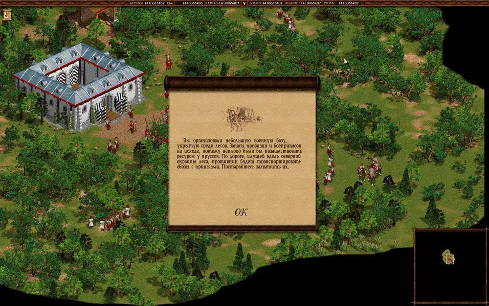 Мясная миссия. Очень важно с самого начала действовать быстро. Сразу же вам надо перекрыть три направления — север (по восточному краю карты), северо-запад (у башни) и запад (сначала у башни, потом расширяйтесь и заберите территорию с золотой жилой). Не прекращайте строить и улучшать войска и производить крестьян, отправляя их на добычу еды и дерева. Меняйте еду и дерево на золото, на которое нанимайте драгунов-наемников в дипломатическом центре (я проходил и без них, но, наверное, стоило их взять). После перехода в 18 век будет проще.