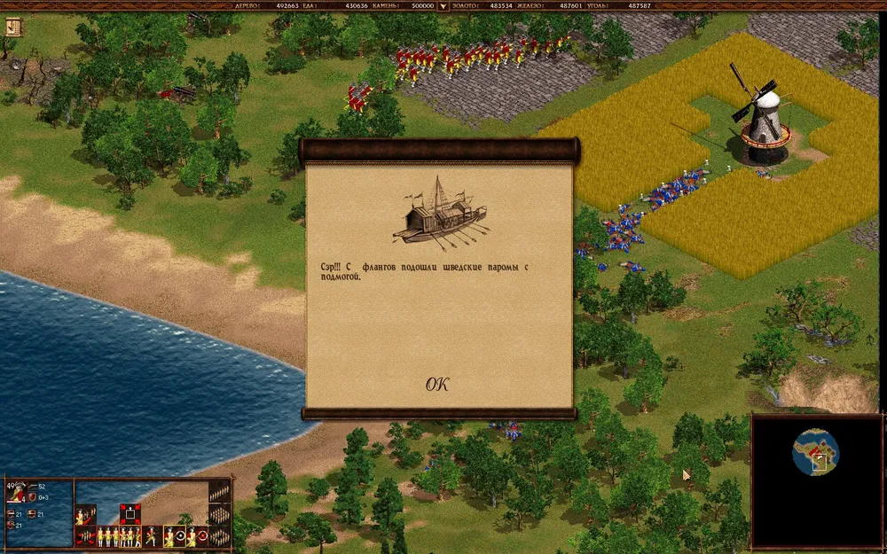 Отправляйте один из двух отрядов по дороге на юго-запад карты, подавляя бунты, а другой в центральный город, а после подавления бунта — в рыбацкую деревню. Начинайте клепать пикинеров и улучшать войска. Датчане предложат перемирие. Соглашайтесь, оно ненадолго.