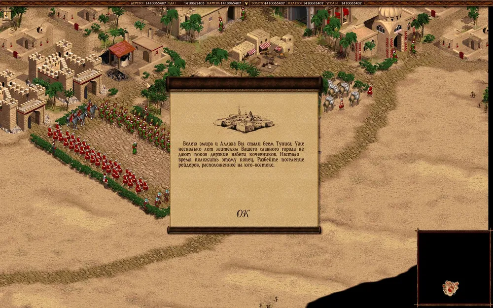 Самая сложная миссия этой кампании. Итак, мы — правитель Туниса. Наша задача — отбиваться, а затем разгромить (чтобы не мешались) кочевников справа от города. Для этого вам хватит пикинеров (не забудьте их хоть немного прокачать) и лучников. Лучше разобраться с ними быстрее, тем более, что по пути встретите купца у которого под угрозой пытки можно выведать, где он спрятал сбережения в размере 5 тысяч золотых. Также постарайтесь отбить себе железные и угольные шахты (к северо-западу и северо-востоку от вашего города, соответственно).