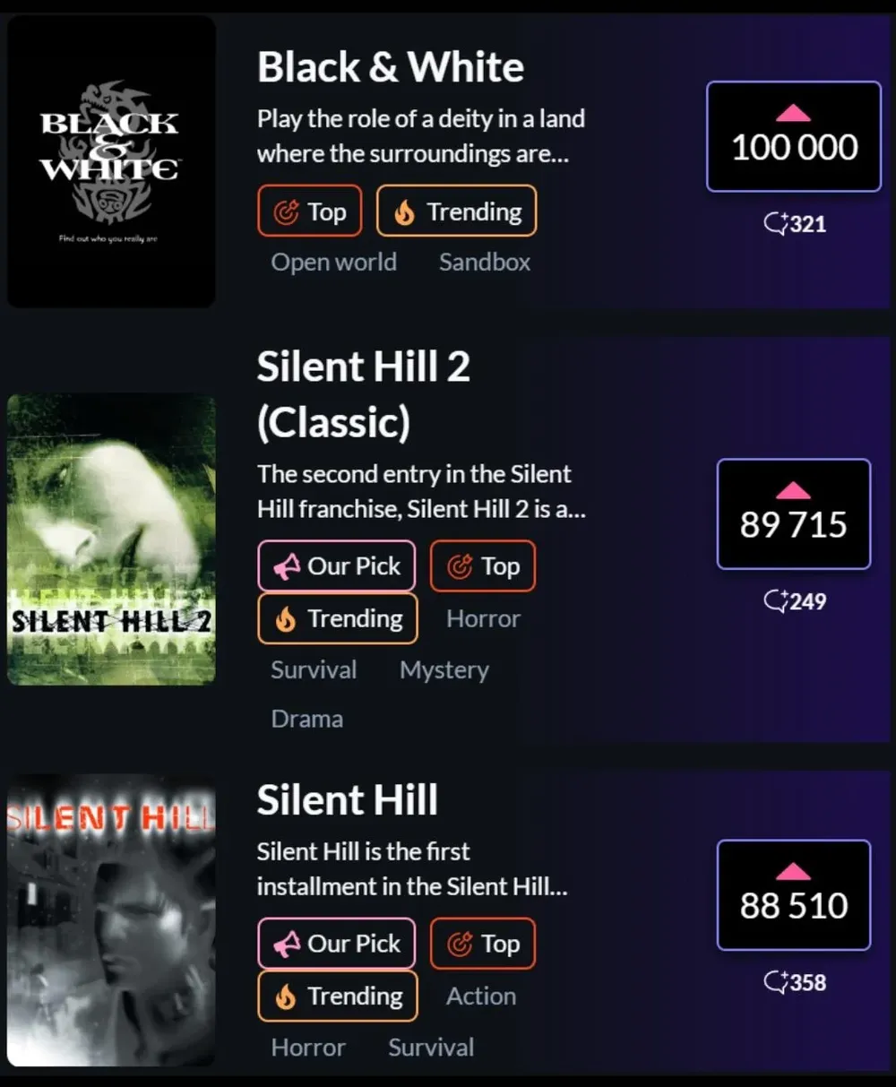 Abandonware-симулятор Бога Black & White 2001 года от Lionhead Studios набрал более 100,000 голосов, став лидером голосования. В то время как вторая часть Black & White набрала более 87,000 голосов.