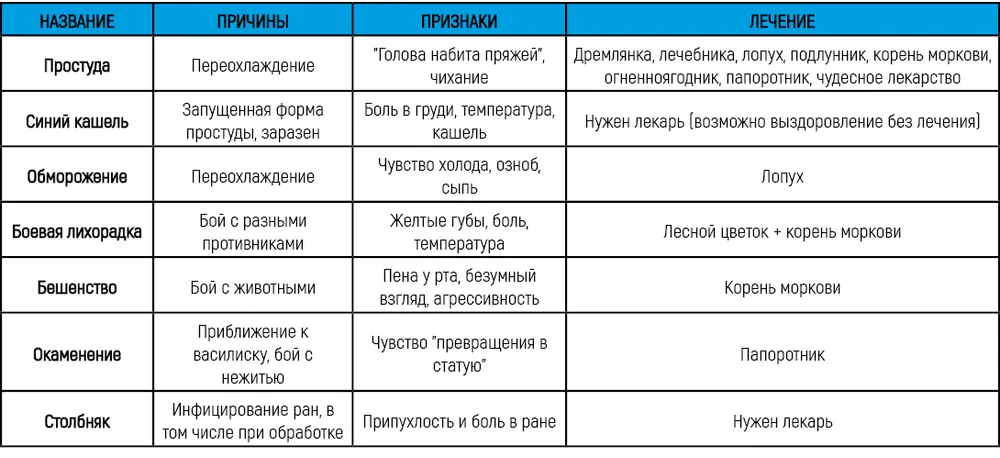 Персонажи в игре довольно часто болеют. В таблице ниже показаны основные способы лечения. Обращение к лекарю далеко не всегда эффективно, это зависит от его квалификации. Так же могут помочь молитвы в храмах.