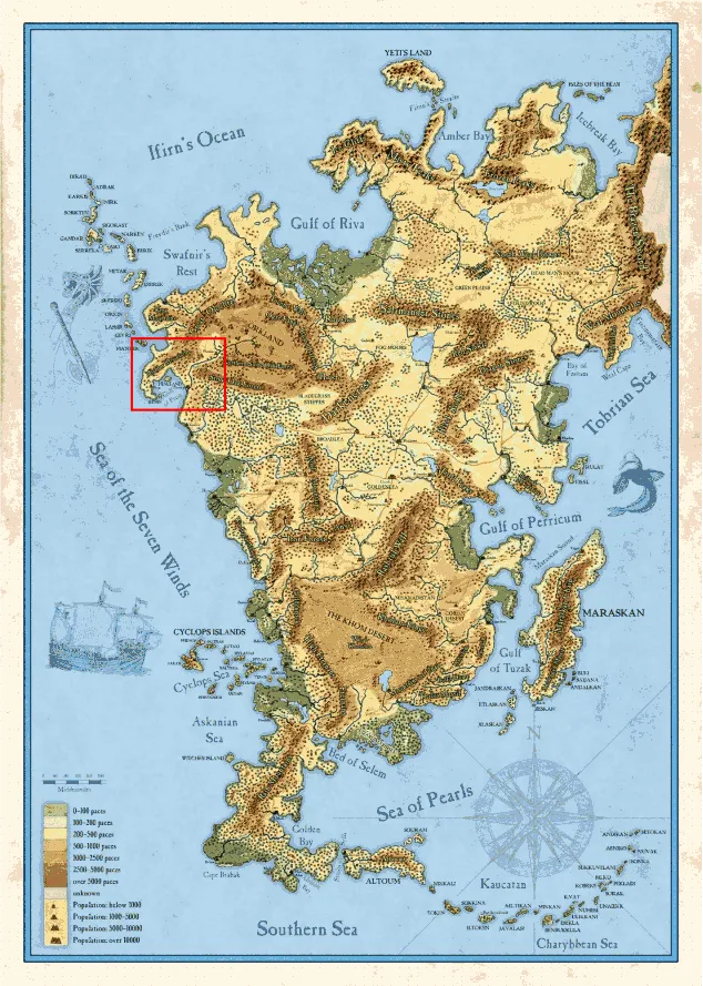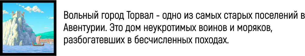 К западу от Земель Орков, между реками Ингваль и Свельт, расположен знамениты Торваль - город суровых пиратов и мореплавателей, бороздящих прибрежные воды Авентурии в поисках добычи. Именно в этом регионе развернется действие игры (см. карту выше, очерчен красным прямоугольником). Предки торвальцев два тысячелетия назад вступили на берега Авентурии, навсегда покинув благословенную Золотую Землю.