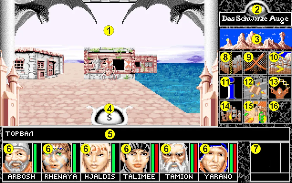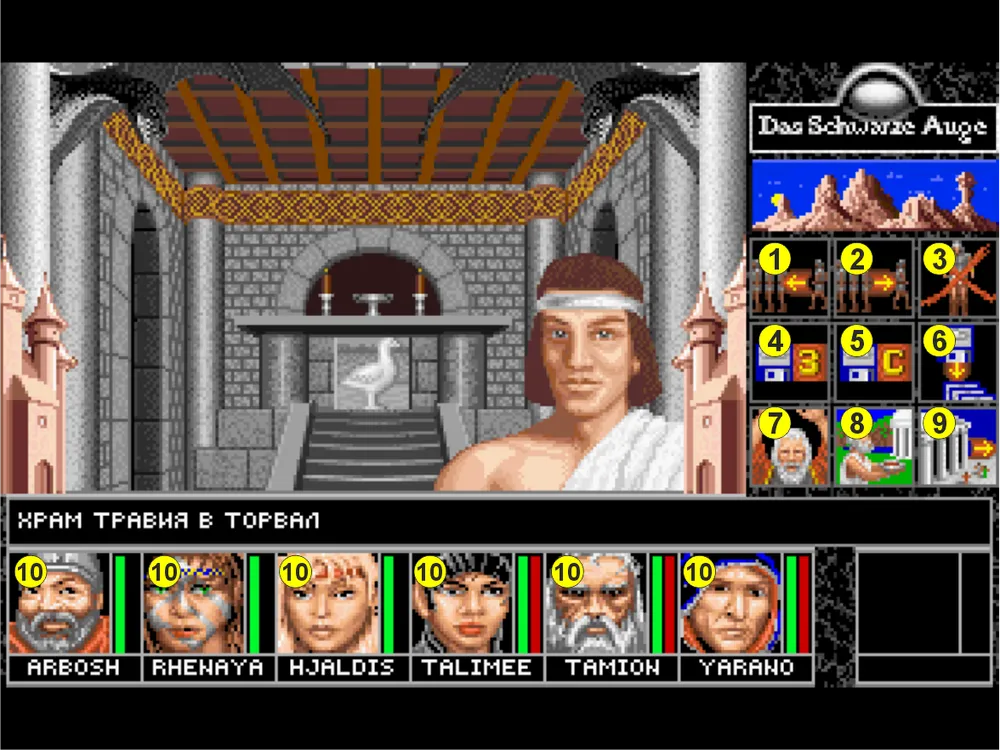 6. Портреты персонажей. У каждого персонажа вашего отряда есть портрет, на котором показаны его наиболее важные атрибуты. Помимо имени, количества очков жизни (зеленая шкала) и очков астрала (красная шкала), портрет выполняет еще две важные функции.