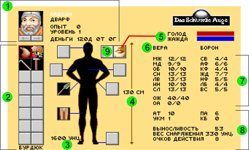 1. Главная информация. На этой панели экрана указаны: имя персонажа, его класс, количество очков опыта, текущий уровень, количество имеющихся денег. Деньги сортируются по трем категориям: золотые дукаты, серебряные кроны и медные монеты. При помощи стрелок, расположенных под портретом персонажа, можно открыть экран другого члена отряда.