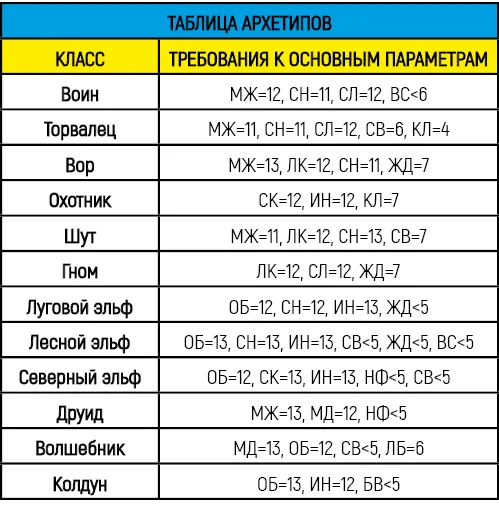 Традиционные сокращения в игре и в таблице архетипов: МЖ - мужество, МД - мудрость, ОБ - обаяние, ЛК - ловкость, СН - сноровка, ИН -интуиция, СЛ - сила, СВ - суеверие, БВ - боязнь высоты, КЛ - клаустрофобия, ЖД - жадность, НФ - некрофобия, ЛБ - любопытство, ВС - вспыльчивость.