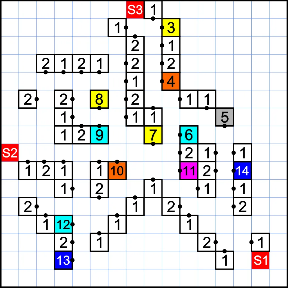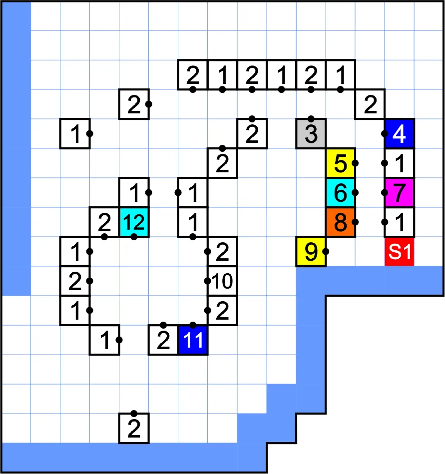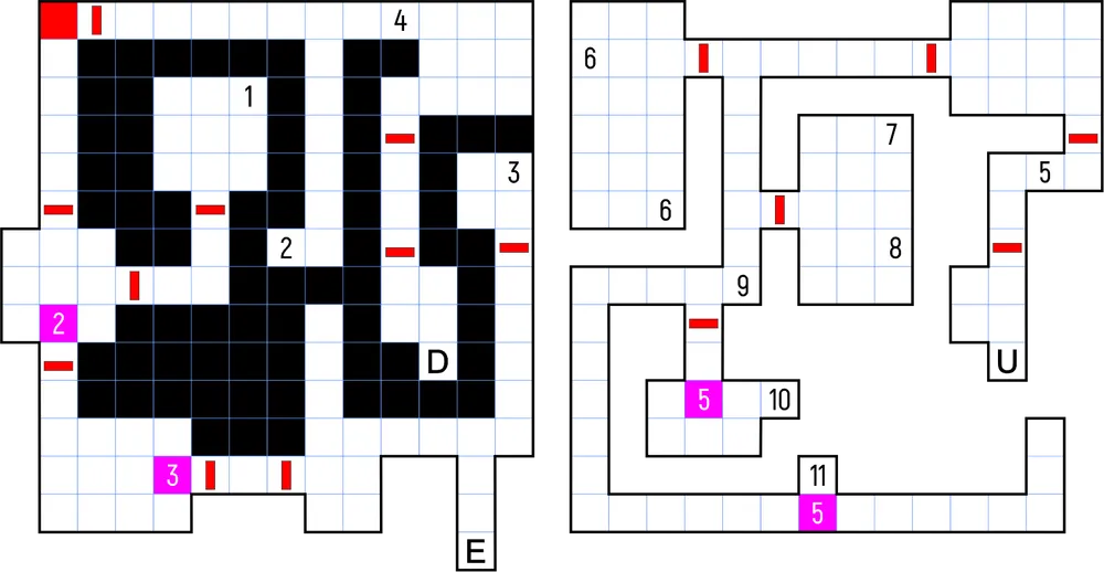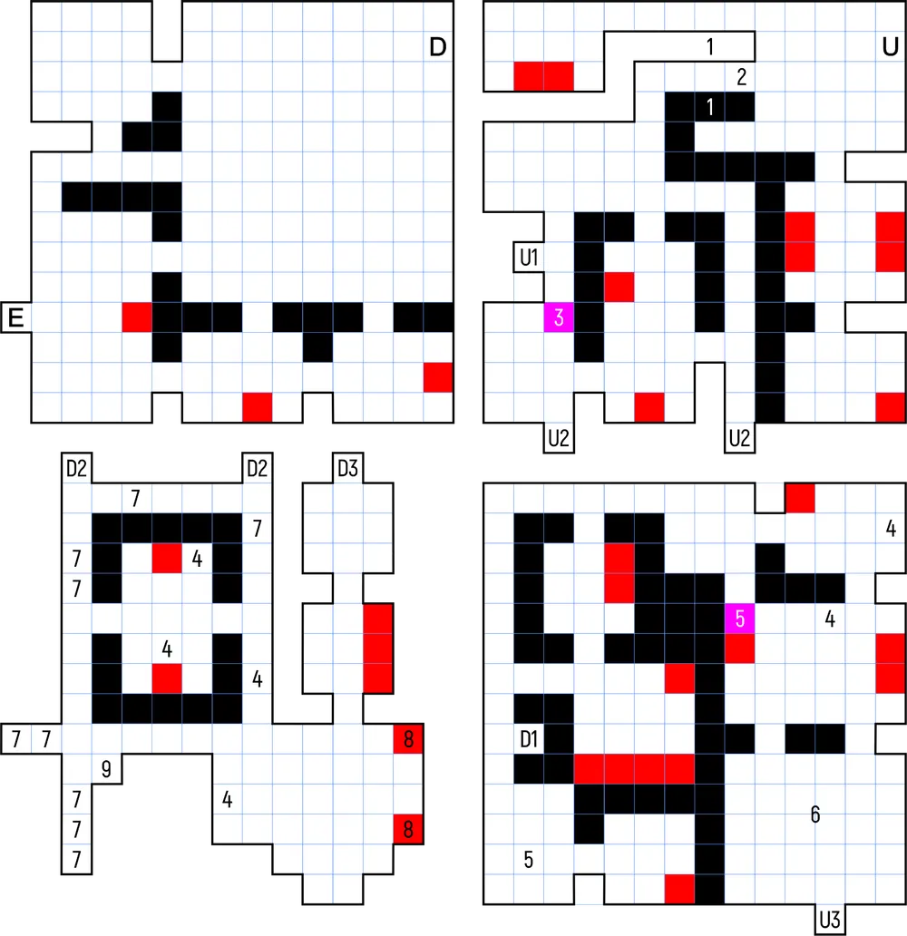 Е – выход из пещеры. Лиловыми участками пола показаны враги, число обозначает их количество. Красными участками пола показаны ловушки.