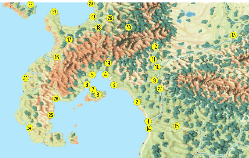 1 - Торваль. 2 – Ваэрмхаг. 3 – Варнхайм. 4 – Даспота. 5 – разваленная гостиница. 6 – Оттарье. 7 – Льясдал. 8 – ферма Хьялланда. 9 – Ауплог. 10 – Вильнхайм. 11 – Верхний Оркам. 12 – Фельштайн. 13 – Фекскаэр. 14 – Серске. 15 – Брейда. 16 – Орвил. 17 – Ала. 18 – Тосс. 19 – Рибон. 20 – Лискор. 21 – Оверторн. 22 – Брендхил. 23 – Видзанд. 24 – Корд. 25 – Прем. 26 – Скьял. 27 – Ангбодиртал. 28 – Хьялсингор. 29 – Кланег. 30 – Оркангер.