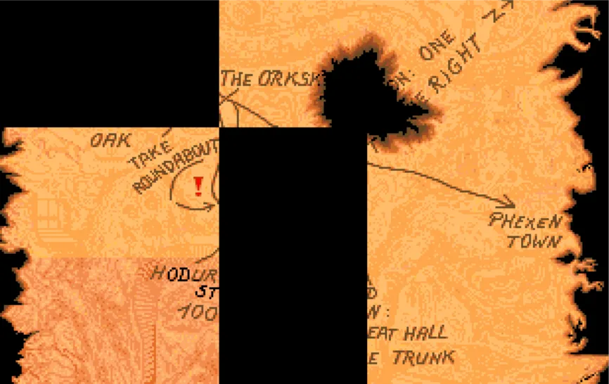 Наконец, имея при себе не менее семи фрагментов карты, один из ваших персонажей, когда вы будете путешествовать из Вильнхайма в Фекскаэр, заметит на другом берегу реки дуб, некогда обжитый драконом, и вспомнит, что уже видел такой на карте. После этого вам придется отыскать место, где можно переправиться через реку, затем прорубиться сквозь кустарник к тропе, а потом выбрать сухую дорогу, чтобы не идти по болотистой местности. Увидев насыпь из земли и камней, изучите ее. На могиле вы заметите сгнившую тростниковую сетку, напоминающую половину колеса телеги. На камне, который находится рядом с ней, вырезана надпись. Первые три буквы на ней уничтожены непогодой, но остальные «…ГАР» еще можно прочесть. Сотките новое колесо Борона и положите его на могилу. Добравшись до устья реки, перейдите реку и поднимитесь в гору. Вскоре тропа выведет вас к руинам замка. Приступайте к его изучению.