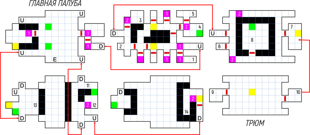 Лиловыми участками обозначены места схваток с врагами, число показывает их количество. Зелеными участками показаны открытые люки, в которые можно провалиться. Желтыми участками показаны места падения с верхних уровней.