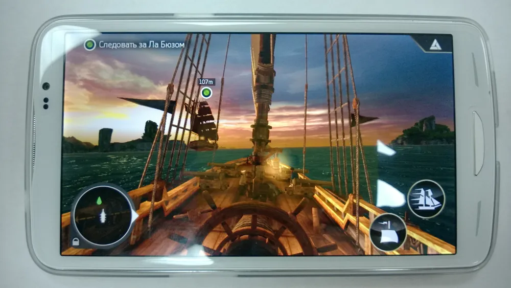 В Assasin's Creed Pirates есть несколько игровых ситуаций (по крайней мере я опишу те, с которыми успел столкнуться сам). Первая - это плавание до пункта назначения. Плавая, игрок минует препятствия и вражеские корабли, корректируя свой курс с помощью парусов и штурвала, крутить который можно очевидным жестом.
