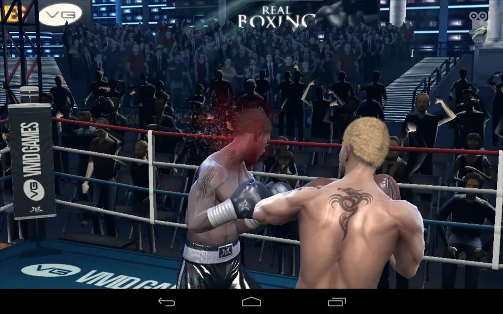 Вернемся к визуальной составляющей Real Boxing. Версия игры для Tegra 3 включает улучшенные текстуры, дополнительную геометрию и анимацию, улучшенные эффекты освещения и даже эффекты depth of field. Наверное, более совершенной на данном уровне развития мобильных технологий, ее сделать было бы невозможно. Unreal Engine показывает все, на что он способен. Брызги пота, перекатывающиеся мускулы боксеров, крупные плану ударов в челюсть, с неизменными брызгами кровищи и вылетающей защитной капой для зубов, о да! Конечно, не стоит ждать кинореализма, но если вы хотите показать кому-нибудь, зачем в вашем планшете или смартфоне установлен такой мощный процесcор, то Real Boxing вам поможет в этом без всяких вопросов.