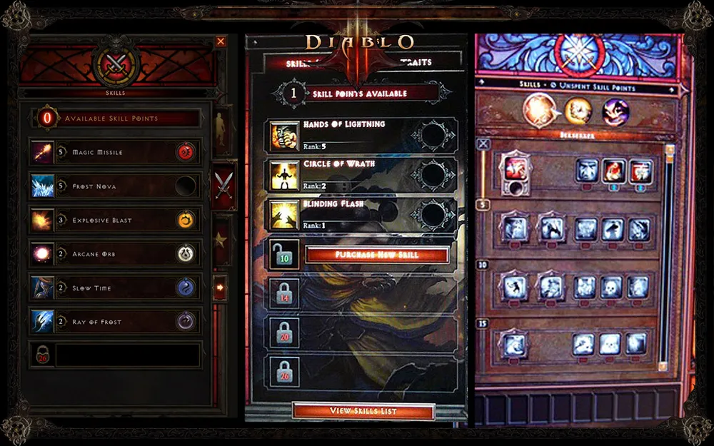 Помимо рун и талисманов был пролит свет на интерфейс навыков. Новая, с иголочки картинка как раз была выложена на официальном сайте и выглядит очень аккуратно, наглядно и лаконично. Для сравнения предлагаю вам посмотреть на то, как выглядел интерфейс навыков раньше. Слева - новый вариант, справа - старые. Хотя изменения по сравнению с прошлой версией выглядят по большей части косметическими, нельзя не отметить, что последняя редакция интерфейса представляется наиболее достойной.