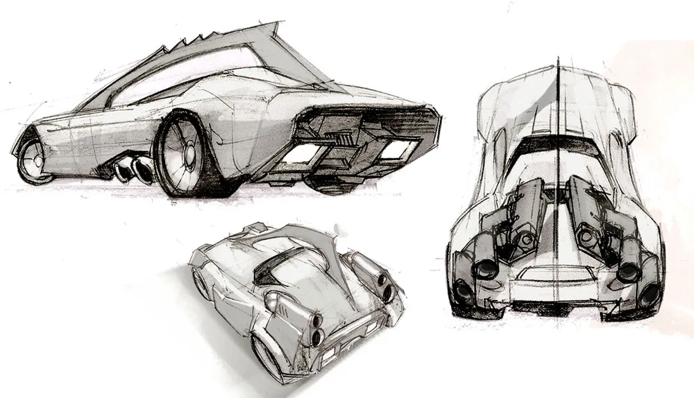 Кроме того, был разработан грубый цветной набросок в профиль. Что нам по-настоящему понравилось, так это частично открытый корпус, и огромные выхлопные трубы с мотоциклетными глушителями. Кроме того, форма корпуса имела намёки на упомянутый GT40: