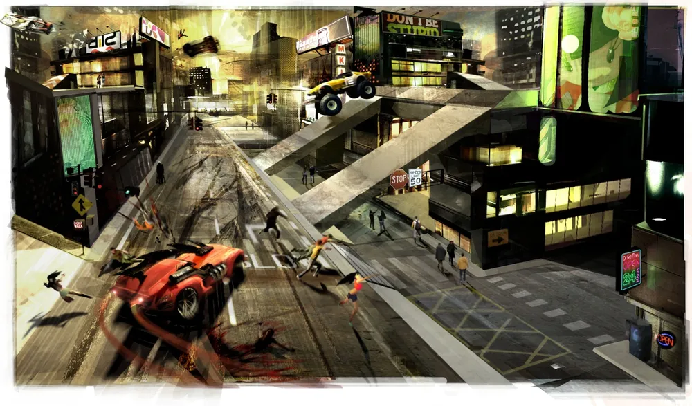 Уже несколько лет Tez работал в Австралии в должности главного игрового арт-директора. В перерыве между работами я вдруг обнаружил, как у меня в почте оказались очень даже неплохие арты – Tez решил показать мне кое-какой «фан-арт»! всё быстро переросло в короткий цикл обсуждение/обратная связь, и дискуссию о направлении переосмысления городского окружения. Tez обратился к оригинальному Блик Сити из Carmageddon, и вспомнил некоторые интересные моменты того, как разрабатывалась художественная составляющая оригинальной игры: