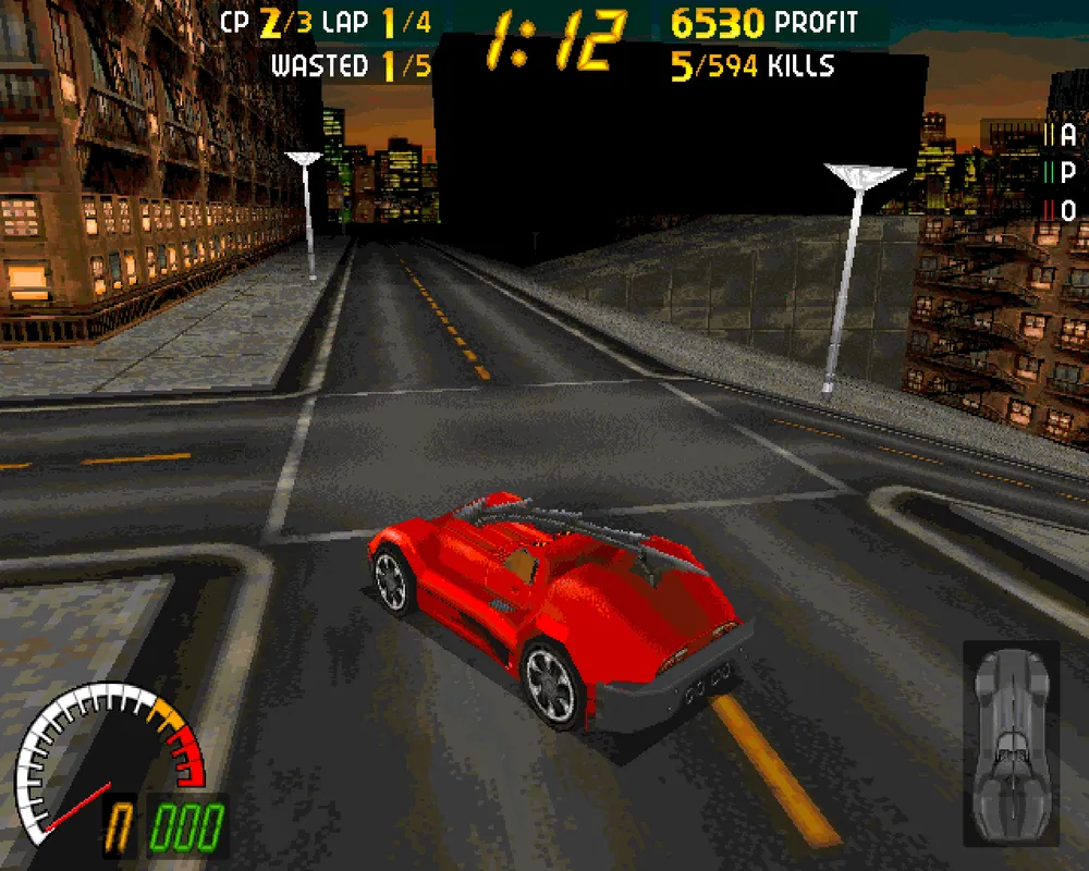 Tez: «Я тщательно изучил трассу 'Rooftops', сделал захват изображения и прогнал картинку через фильтр «мозаика». На этой серо-коричневой трассе много насыщенных цветов – но это происходит из-за сумасшедших оранжевых окон и ярко жёлтого HUD’а, а не из за насыщенности цвета самой трассы – если конечно не обращать внимание на изумрудную траву» :) Мне приходилось вытягивать графику из этих 256 цветов, и приходилось много думать, но елки-палки, как же сложно было согласовывать цветовую палитру окружения! Я думаю, мы использовали много тёплых цветов для того, чтобы попробовать оттенить с их помощью слишком тёмные места.