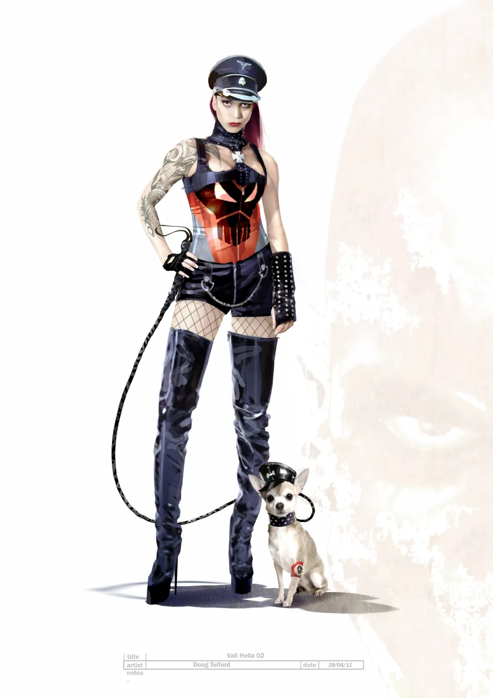 Дуг, с моими заметками, радостно (сюрприз!) отправился работать над Вэл. Но, первым делом, он начала работу со Скрюи, и после того как мы решили "потерять" Скрюи ноги и подарить ему сумасшедшее инвалидное кресло, я начал подумывать о том, что было бы неплохо, если бы у каждого нашего персонажа мог бы быть какой то дополнительный "штрих" или визуальная черта, которая поможет идентифицировать его во всей полноте. У меня в голове тут же сформировался "штрих" который подходит Val. И, в следующий раз, когда я писал Дугу, я добавил: "С нетерпением жду картинки с Вэл Хеллой'ой... Думаю, что стоит подумать над "штрихами" для всех персонажей... Может быть, у неё есть миниатюрная собачка, в нацистской униформе или что-то в этом роде... :D"
