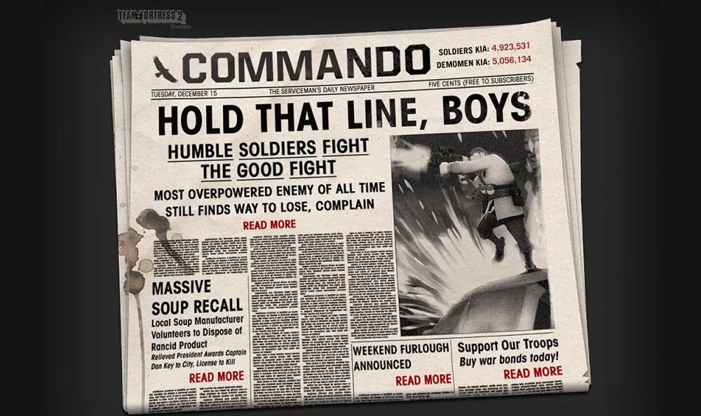 Для всех уклоняющихся от войны сообщаем, что вы всё еще можете совершить послевоенные подвиги, чтобы рассказать о них внукам, потому что Team Fortress 2 в очередной раз объявляет бесплатный выходной, который начнётся ночью в Четверг как только выйдет обновление (а пока что вы можете начать скачивать TF2).