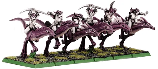 Чемпион верхом на этом скакуне – крайне опасный противник, поскольку эти звери носятся по полю боя с ошеломляющей скоростью, набрасываясь на зазевавшихся врагов и зарубая их хлесткими и мучительными ударами острого языка. Поэтому их иногда называют Кнутами Слаанеша или Хлестающими Языками.