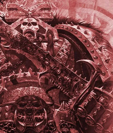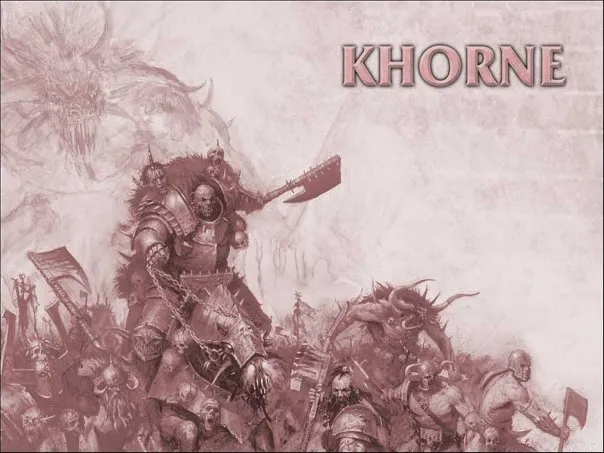 Кхорн - Бог Крови, злой убийца, Бог Хаоса, ревущий о неутоленной ярости через время и пространство. Его величественный бронзовый трон стоит на основании из горы черепов, что возвышается среди пустошей раздробленных костей и озер крови; останков погибших в битве служителей и тех, кого убили во имя его. Кхорн олицетворяет бессмысленное, возведенное в ранг абсолюта насилие, уничтожающее всех и вся в пределах досягаемости, равно смертельное для друга и врага.