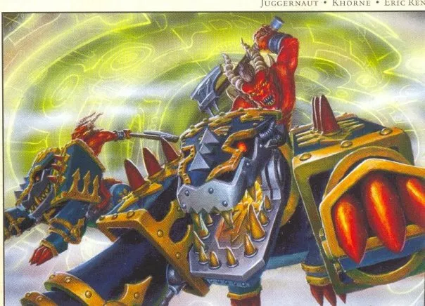 Самые приближенные чемпионы Кхорна едут верхом на джаггернаутах. Земля дрожит, когда джаггернаут устремляется в атаку, и немногие смогут устоять, когда в отряд врезается, сминая ряды, страшный воин верхом на таком коне.