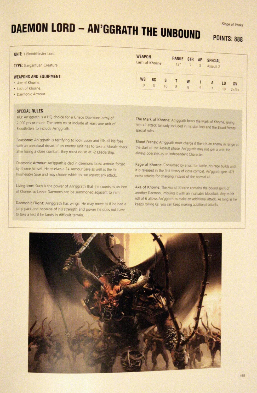 Пытающиеся призвать его должны сначала угодить Кхорну преданностью и резней, но мало кто достаточно самоуверен даже для попытки, ибо на недостойных обрушивается ужасающий гнев Кровавого Бога. За прошедшие 10.000 лет Ан’Гграта вызывали из варпа лишь три раза, и после двух первых призывов на Империум обрушилось чудовищное разрушение. Под раздвоенными копытами Жаждущего Крови пали целые миры до того, как Серые Рыцари смогли остановить его буйство ценой ужасающих потерь.