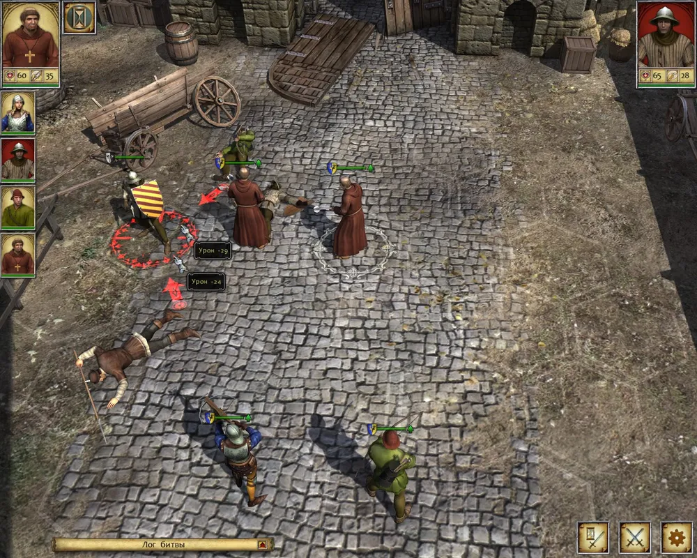 И последний (но отнюдь не по значению) нюанс, о котором я хотел бы рассказать — это раны. Их получают бойцы, если удар снимает больше половины базового (то есть без учёта бонусов экипировки) здоровья. Или если показатель здоровья доходит до нуля. Да, даже если вашего бойца застрелили или зарубили — у него ещё есть шанс встать после окончания боя. Но только если у него не накопилось три серьёзных ранения. В этом случае боец умирает насовсем. Так что, если ваш боец из-за ран едва стоит на ногах (в буквальном смысле, ведь каждое ранение ещё и снижает все параметры, включая инициативу) иногда лучше оставить его так, чем применять лечебное заклинание и рисковать получить последнюю, смертельную рану. Лучше уж подождать до конца боя и потом исцелить бойца в монастыре, где лечат обстоятельно — убирая в том числе и ранения.