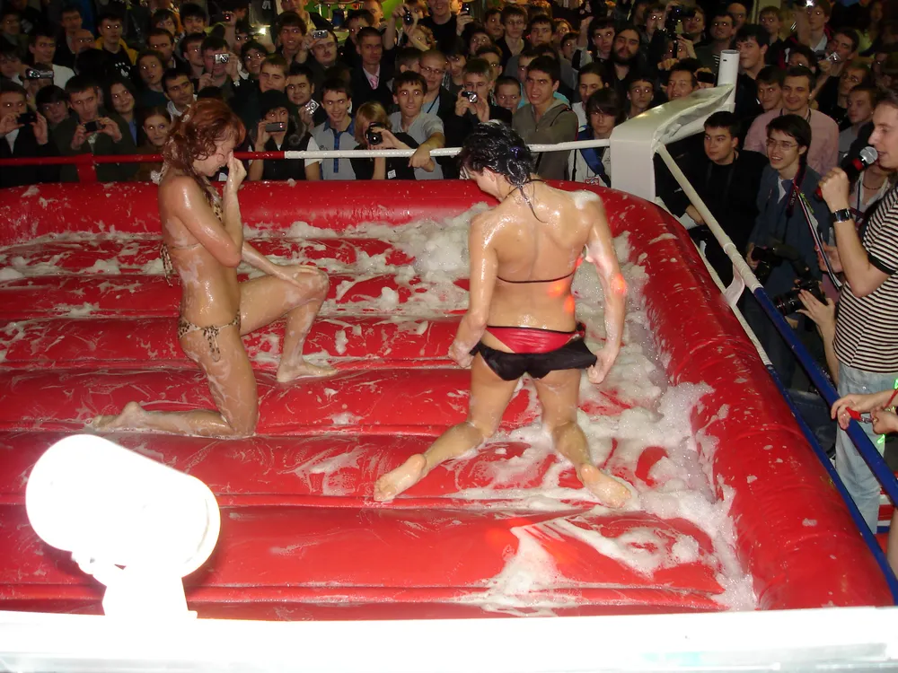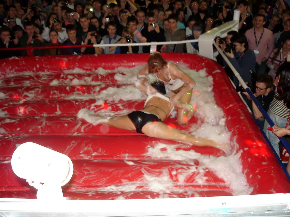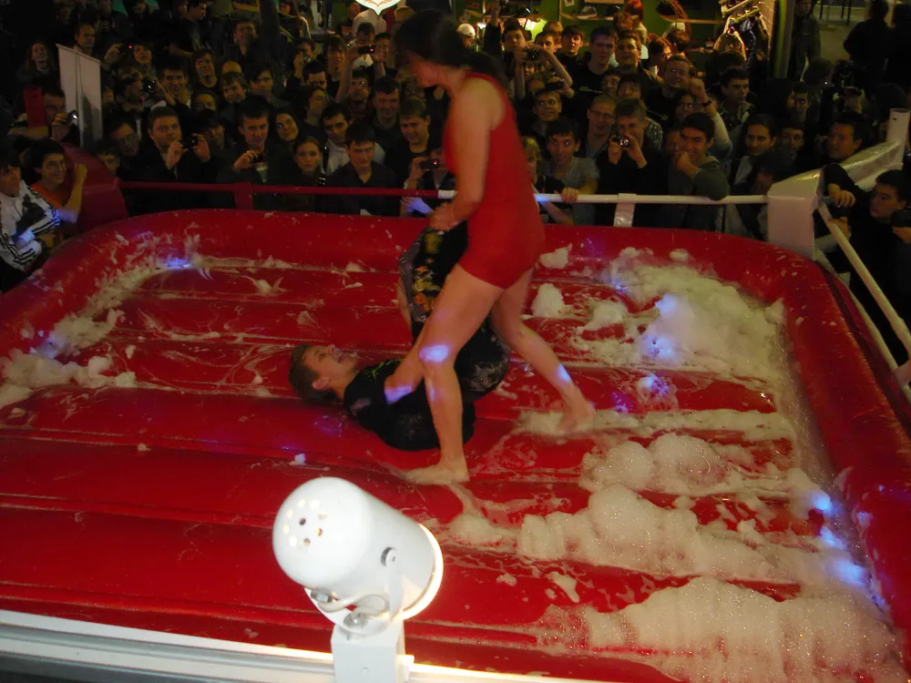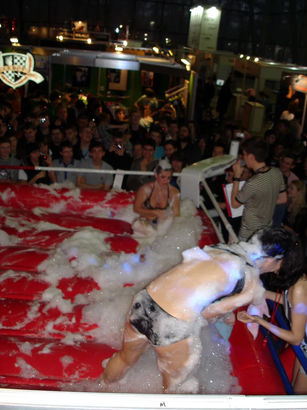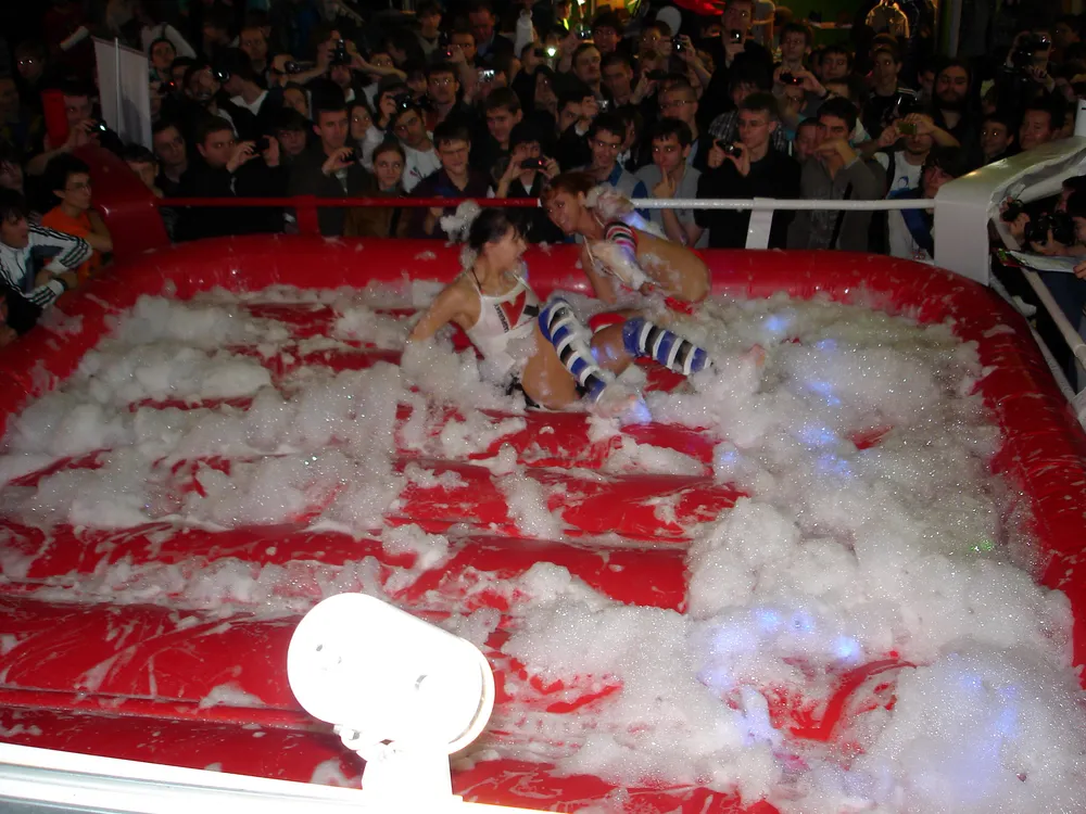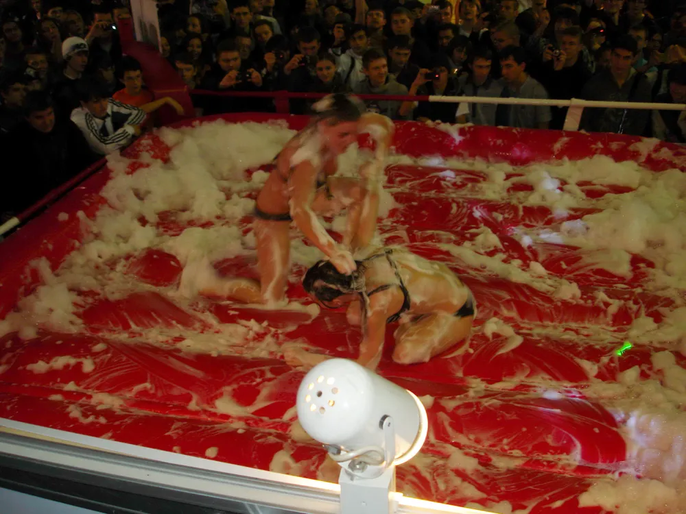 Сперва был рестлинг в пене. Не даром ведущий предупреждал зрителей отойти подальше, чтобы не получить "пяткой в глаз". В результате одного приёма участница чуть не вылетела за пределы ринга :)